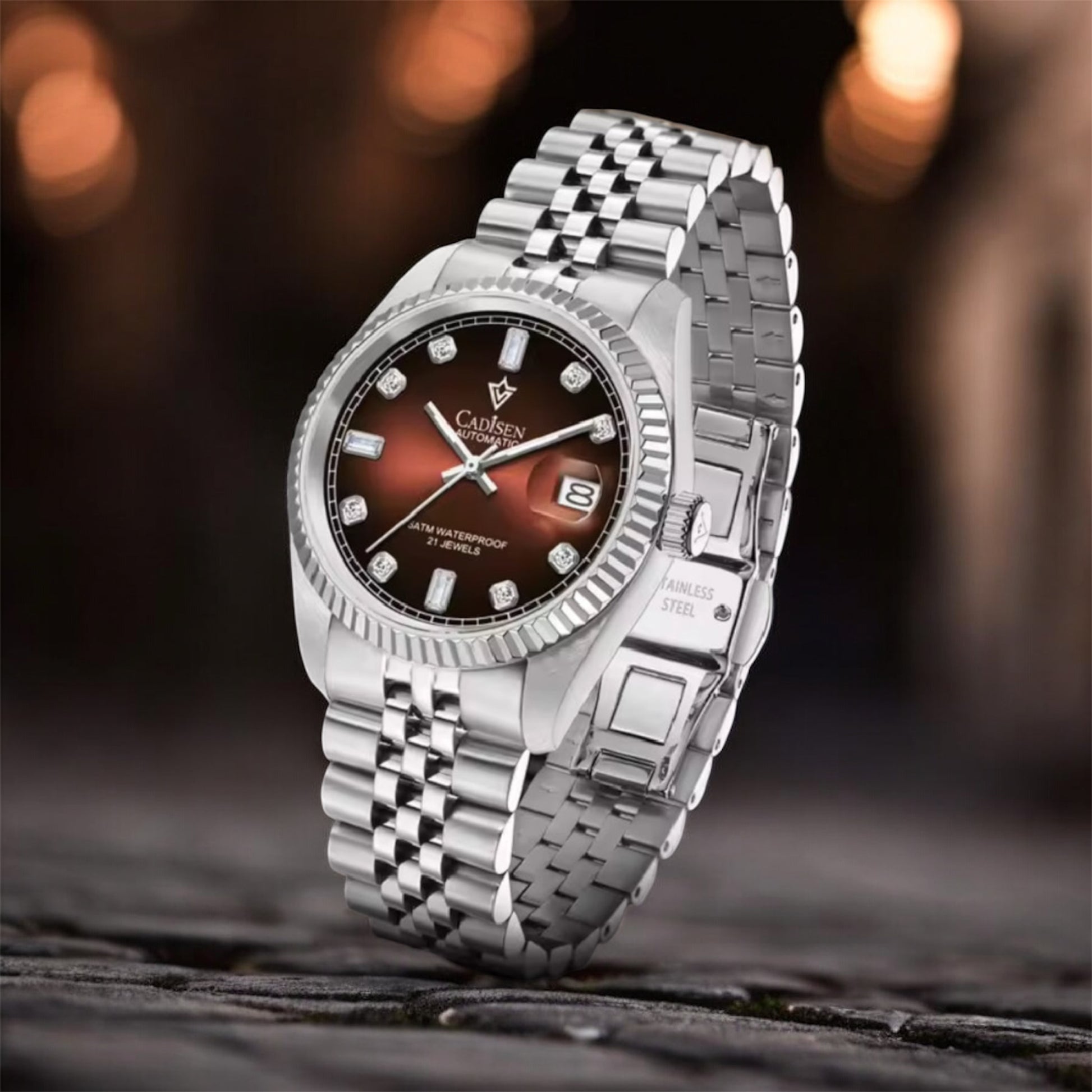 Die CADISEN NEUE mechanische 38 MM Uhr ist ein hochwertiges und präzises Armbanduhr für Männer. Mit einem Japan MIYOTA 8215 mechanischen Uhrwerk und Edelstahlgehäuse und -armband bietet sie genauigkeit für präzises Zeithalten. Der Saphirglas mit AR-Beschichtung ist kratzfest und die Uhr ist wasserdicht bis zu einer Tiefe von 50M. Eine stilvolle Uhr, perfekt für jede Gelegenheit.